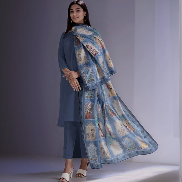 Gender:Â Womenn Category:Â Accessoriesn Outfit Type:Â Dupattan Color Type:Â Bluen Fabric:Â Silkn Work Technique:Â Printedn Additional Description:Â Artful hand-painted designs re-imagined through digital printing, blending heritage with