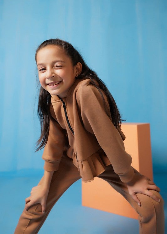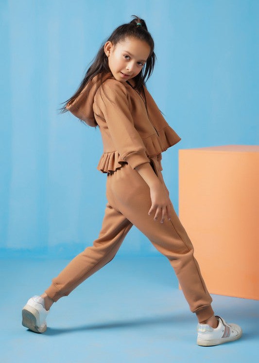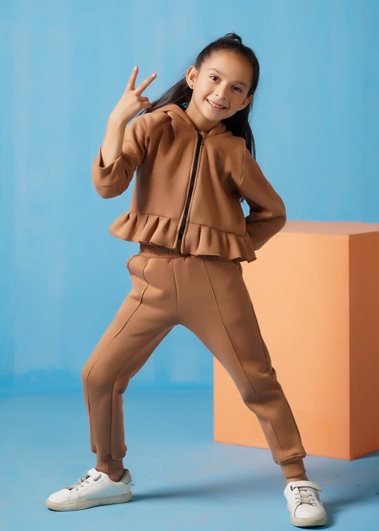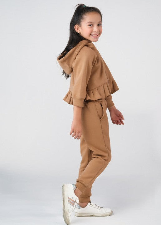 Raglan Sleeve Ruffle Hem Hoodie With Sweatpants – Coffee Brown